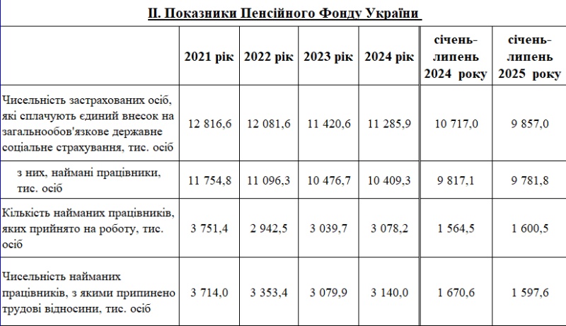 Согласно данным Пенсионного фонда Украины, численность застрахованных лиц в Государственном реестре общеобязательного государственного социального страхования в январе-июле 2025 года составила 9,857 млн человек, что на 860 тысяч меньше, чем в соответствующем периоде прошлого года (10,717 млн).
