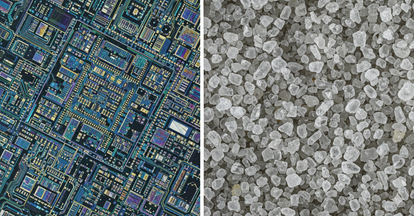 Чтобы превратить кварцевый песок в полупроводник, его очищают до почти абсолютной чистоты — примесей меньше одной части на миллиард. Расплавленный кремний выращивают в виде монокристалла — «слитка Чохральского», который нарезают на тонкие пластины-вафли. Именно на этих вафлях создаются микросхемы.