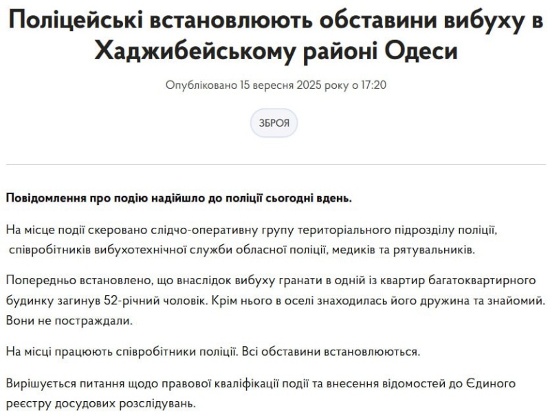 Также Одесская полиция сообщает, что 15 сентября в одной из квартир многоэтажки в Одессе из-за взрыва гранаты погиб 52-летний мужчина. Других подробностей нет. Правоохранители выясняют обстоятельства инцидента.