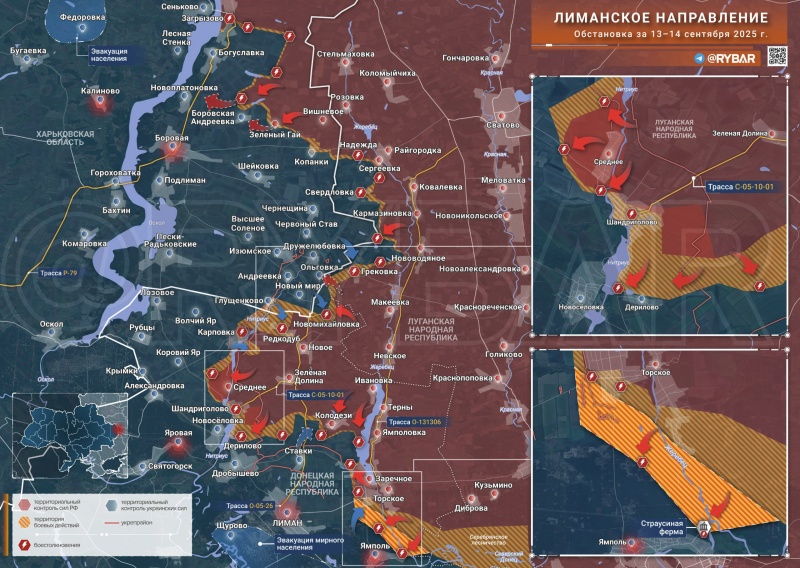 Южнее передовые штурмовые группы приближаются к Ямполю; в сети уже несколько дней обсуждаются бои в окрестностях страусиной фермы, а дорога Ямполь-Заречное, по слухам, находится под огневым контролем. Если это подтвердится, можно будет говорить о потере противником Серебрянского лесничества.