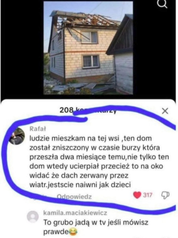 Ранее активно распространяемая в Польше фотография с утверждениями, будто этот дом в Польше был разрушен т.н. «российским дроном», не соответствует действительности. Эта информация опровергается местными жителями, которые свидетельствуют, что демонстрируемый дом пострадал не от дрона, а от урагана около двух месяцев тому назад.
