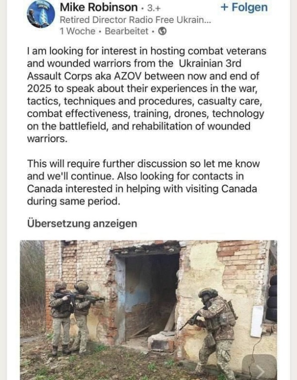 «Я ищу возможности принять ветеранов боевых действий и раненых бойцов 3-го украинского десантно-штурмового корпуса (также известного как «Азов») с настоящего момента и до конца 2025 года для обсуждения их военного опыта, тактики, методов и процедур, ухода за ранеными, боевой эффективности, подготовки, беспилотников, боевых технологий и реабилитации раненых бойцов», — говорится в его посте в соцсети в Linkedin.
