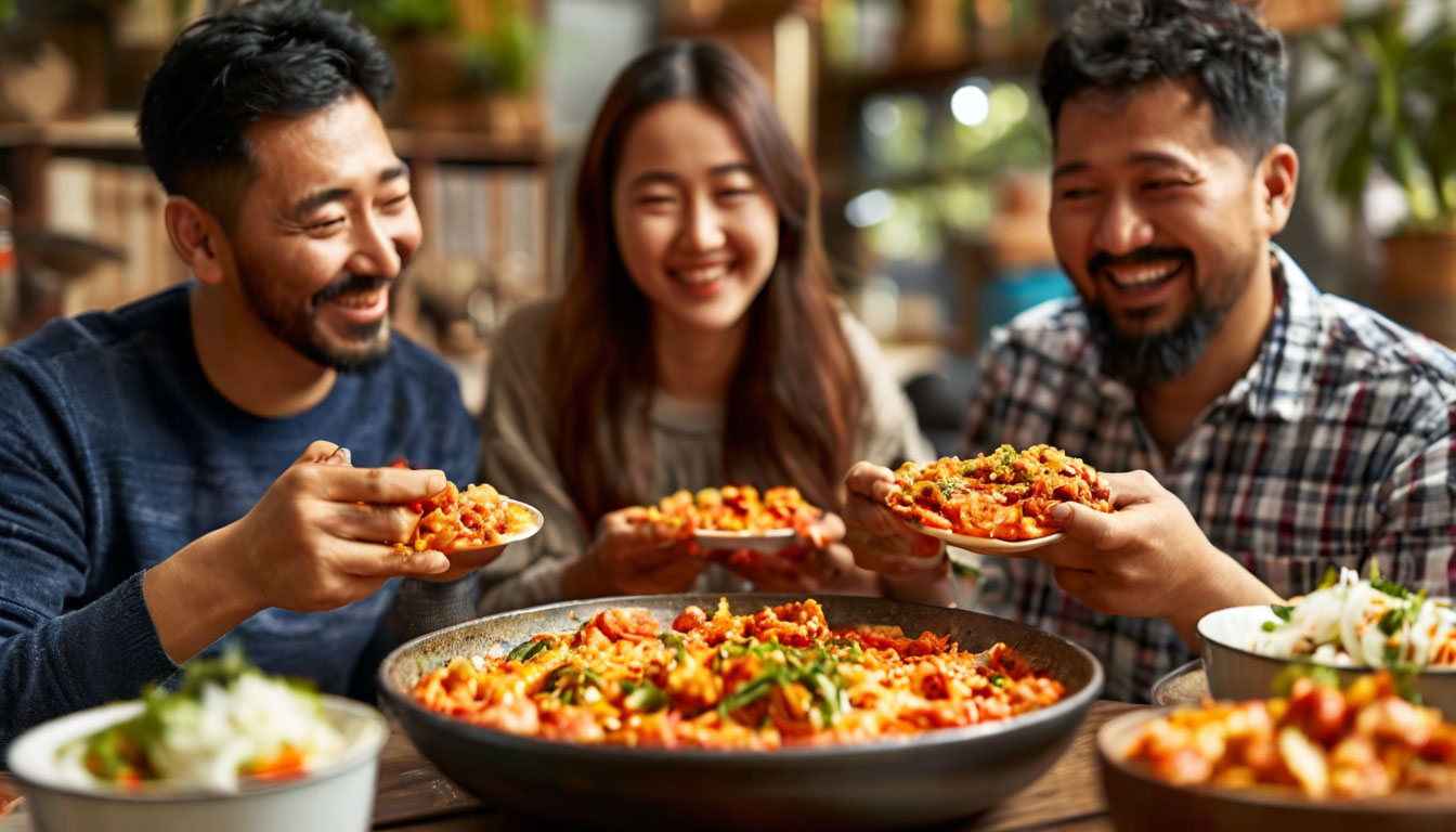 Кимчи, традиционное корейское блюдо, получают путём ферментации смеси из капусты, редьки, чеснока, имбиря, морской соли и молотого перца чили. В процессе спонтанной ферментации активно развиваются молочнокислые бактерии, в первую очередь штаммы Lactobacillus sakei, Leuconostoc mesenteroides и Weissella koreensis. Эти микроорганизмы синтезируют органические кислоты (лактат, ацетат), экзополисахариды и постбиотики, участвующие в регуляции метаболических процессов.