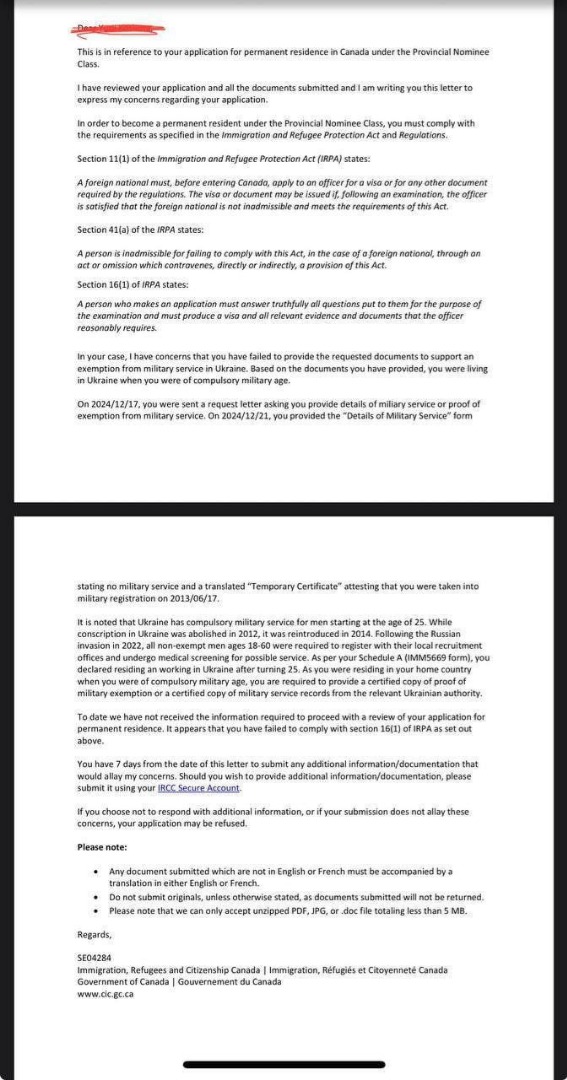 В паблике опубликовали письмо, которое предоставил их читатель. Ответственный офицер направил его адресату после того, как заявитель предварительно ответил на дополнительный запрос относительно информации о военной службе или ее отсутствии (Military records form), добавил приписное свидетельство и объяснение, что никогда не служил и не призывался на службу. Однако это не устроило канадского иммиграционного офицера и заявитель получил письмо следующего содержания: