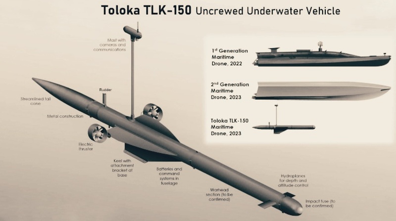 Впервые подводный дрон линейки Toloka был представлен в 2023 году. TLK-150 был задуман как подводный дрон-камикадзе с боевой нагрузкой от 20 до 50 кг. Это делает его пригодным для атак на малые морские цели или береговые сооружения. При длине в 2,5 метра и дальности хода в 100 км и более — он может действовать как тактический подводный аппарат, запущенный с надувных катеров, скрытно подведённых к прибрежной зоне.