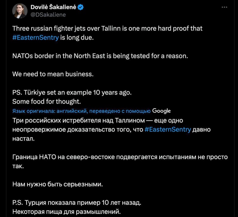 Представители Прибалтики в свою очередь осознанно продолжают нагнетать ситуацию. Министр обороны Литвы Довиле Шакалене фактически призвала сбивать российские истребители, если они будут нарушать пространство стран НАТО. Она напомнила, как Турция на границе с Сирией сбила российский Су-24 в 2015 году.