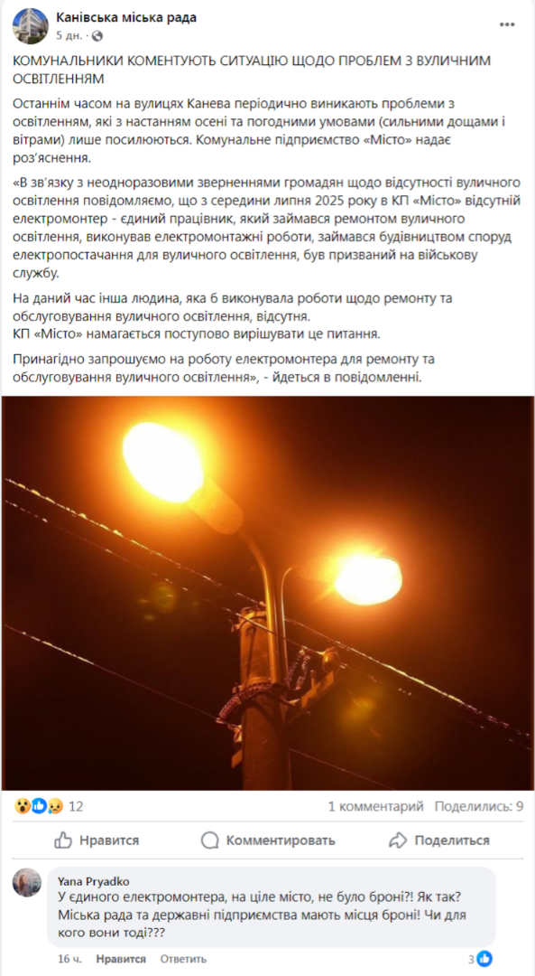 «В связи с неоднократными обращениями граждан по поводу отсутствия уличного освещения сообщаем, что с середины июля 2025 года в КП «Город» отсутствует электромонтер – единственный работник, который занимался ремонтом уличного освещения, выполнял электромонтажные работы, занимался строительством сооружений для уличного освещения, был призван на военную службу.