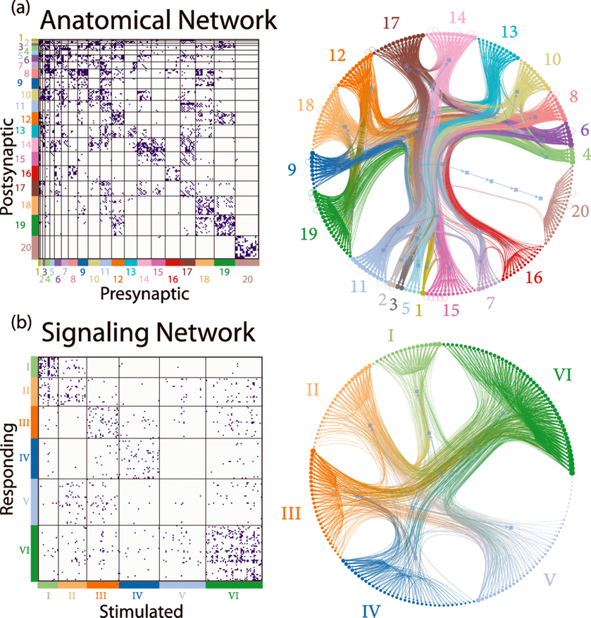 Анализ показал, что состав этих групп в анатомической и сигнальной сетях практически не пересекается. Те нейроны, которые выглядят главными по количеству физических соединений, не обязательно являются главными в реальной передаче сигналов.