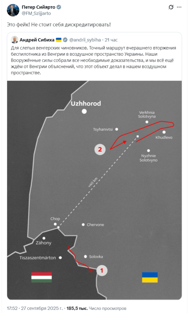 В субботу глава МИД Украины Андрей Сибига сообщил, что ВСУ, мол, собрали все необходимые доказательства вторжения на украинскую территорию венгерского разведывательного дрона, и опубликовал изображение с его маршрутом «для слепых венгерских чиновников».