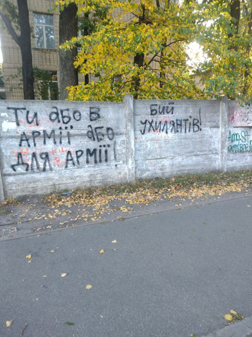 При этом растет и ненависть к тем, кто противится мобилизации. Особенно среди тех, кто пошел защищать режим добровольно, свято уверовав в свет европейского будущего. На киевских заборах уже давно можно прочесть призывы «Бей уклонистов!» и наставления «Ты или в армии или для армии». Ниже на фото надписи на бетонном ограждении одного из исследовательских институтов у метро «Васильковская».