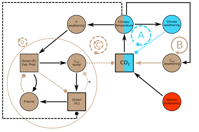 - Двойной отклик. Нагрев ускоряет выветривание и силикатных, и фосфорных пород. В океан попадают потоки веществ. Они, с одной стороны, медленно связывают CO₂, а с другой — приносят очень много фосфора.