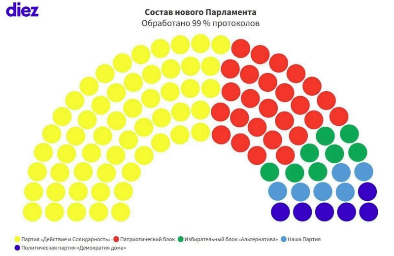 По итогам результатов выборов в стране, обнародованным ЦИК Молдовы, в новом созыве молдавского парламента будет 5 партий. Партия Санду PAS получила абсолютное большинство в парламенте — больше 50% голосов. «Патриотический блок» Игоря Додона получил 24% поддержки. «Альтернатива» стала третьей политической силой в стране, набрав почти 8% голосов. «Наша партия» набрала 6% голосов, PPDA — 5,6%.