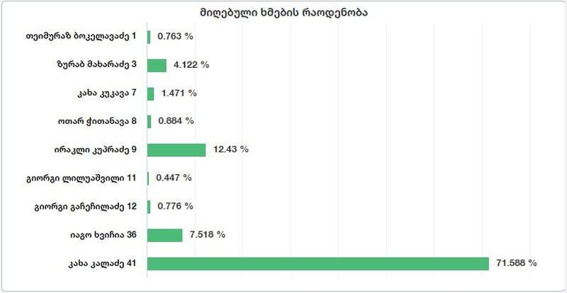 Победу одержала правящая партия «Грузинская мечта». Каха Каладзе набирает 77,4% голосов и, похоже, остается мэром Тбилиси. За этот пост сражались девять кандидатов. Всего в выборах приняли участие 12 партий.