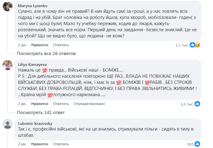 «Грустно, но в чем он не прав? У них идут сами за деньги, а у нас ловят всех подряд и на убой. Брат мужа на работу шел, куча болезней, мобилизовали – годен (из-за чего мы были в шоке). Как-то учебку пережил, ходил к врачу, говорят - розовенький, значит все норм. Первый день на задание - без вести пропавший. Это не на убой? Что не видно было, что человек не вояка?», - написала Maryna Lysenko, собрав под своим постом 1100 «лайков».