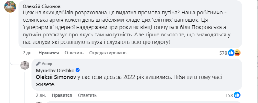 «Это на каких дебилов рассчитана эта выдающаяся речь Путина? Наша рабоче–крестьянская армия каждый день штабелями кладет этих 'элитных' ванюшек. Эта 'суперармия' ядерной сверхдержавы три года как овцы топчутся у Покровска, а путькин рассказывает о каком-то там могуществе. Но хуже всего то, что находятся у нас лопухи, которые развешивают уши и слушают всю эту гадость!», - вознегодовал Oleksii Simonov.