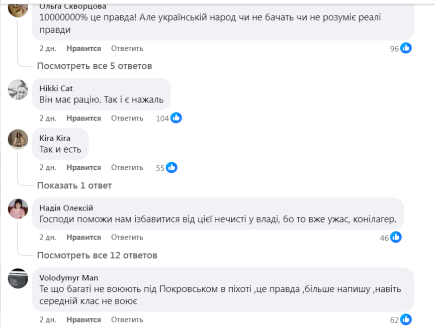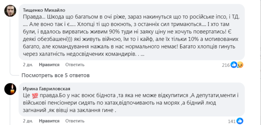 «Это 100% правда. Потому что у нас воюет беднота, но которая не может откупиться, А депутаты, менты и военные пенсионеры сидят по домам, отдыхают на морях, а бедный люд загнан, как овцы на заклание, погибает», - пишет Ирина Гавриловская.