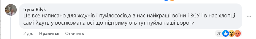 «Это все написано для ждунов и пуйлососов, а у нас лучшие воины и ВСУ и у нас ребята сами идут в военкомат, а все, поддерживающие здесь пуйла, - наши враги», - заявила Ирина Билык.