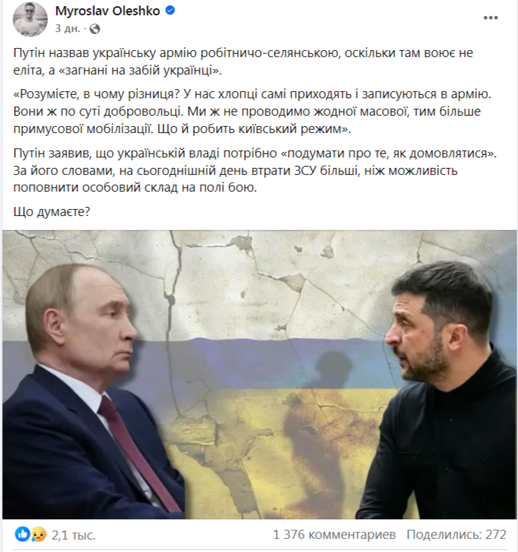 Популярный украинский оппозиционный блогер, очень критично настроенный к режиму Владимира Зеленского, за что вынужден скрываться за границей, опубликовал этот тезис российского президента на своей странице в Facebook*, поинтересовавшись, что его подписчики думают об оценке ВСУ Владимиром Путиным.