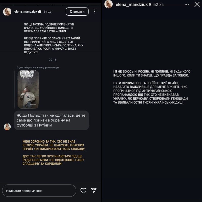«Как это можно подобное сравнить? Вчера, от украинцев в Польше, я получила такие замечания. Не от поляков! Закон у них такой не принят, а только ведется подобная антиукраинская политика, которую подпитывает Россия, а украинцы уже и ведутся. Мне стыдно за тех, кто не знает историю Украины, не уважают собственных героев, которые боролись за нашу свободу. До сих пор так легко прогибаются под еще советские мифы и не отстаивают наше наследие за рубежом!» — ответила упреки и хейт Мандзюк.