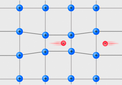 В обычном проводнике электроны движутся беспорядочно, сталкиваясь друг с другом и с решеткой материала. В сверхпроводнике они создают пары, которые называют парами Купера.