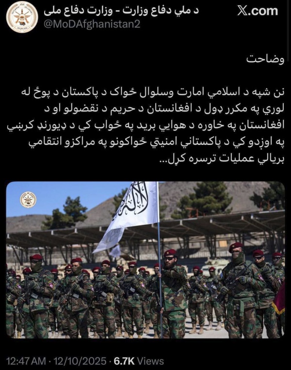 Вечером 11 октября военные столкновения вспыхнули на афганско-пакистанской границе. Столкновения происходили по всей линии Дюранда — демаркационной границе между Афганистаном и Пакистаном, установленной в 1893 году, легитимность которой до сих пор оспаривается Кабулом.