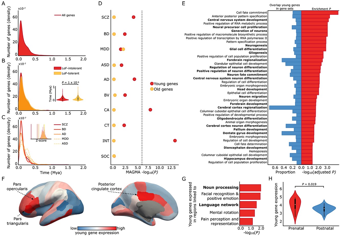 Анализ и карта активности в мозге для эволюционно молодых генов. A) Хронология появления генов за последние 2 миллиона лет. График показывает, как много генов появлялось в разные периоды времени. B) Сравнение возраста генов по их важности. Гены, которые не терпят мутаций, то есть самые важные для выживания (LoF-intolerant), оказались значительно моложе, чем менее важные гены (LoF-tolerant). C) Хронология генов, связанных с 5 основными психическими расстройствами. Гены, связанные с шизофренией (SCZ), биполярным расстройством (BD) и болезнью Альцгеймера (AD), оказались эволюционно моложе, чем ожидалось случайно. D) Анализ самых молодых и самых старых генов. Проверка показала, что среди самых молодых генов непропорционально много тех, что связаны с интеллектом (intelligence) и площадью коры мозга (CA). Среди старых генов такой связи не обнаружено. E) За что отвечают молодые гены. Анализ показал, что половина биологических функций самых молодых генов напрямую связана с развитием мозга. Жирным шрифтом выделены процессы, связанные с мозгом. F) Карта активности молодых генов в мозге. Эти гены наиболее активны в зоне Брока (ключевой центр речи), а также в задней поясной коре (участок, важный для самосознания и памяти). G) Активность молодых генов во время мышления. Молодые гены особенно активны в участках мозга, которые работают во время выполнения когнитивных задач. Наиболее сильная связь обнаружена с задачами, связанными с языком (выделены жирным). H) Активность молодых генов до и после рождения. Молодые гены значительно более активны на пренатальных стадиях (во время внутриутробного развития), чем на постнатальных (после рождения). AD: болезнь Альцгеймера ASD: расстройство аутистического спектра BD: биполярное расстройство BV: объем мозга CA: площадь коры CT: толщина коры INT: интеллект LoF: Loss-of-Function (потеря функции гена из-за мутации) MDD: большое депрессивное расстройство Mya: миллион лет назад SCZ: шизофрения SOC: социальность