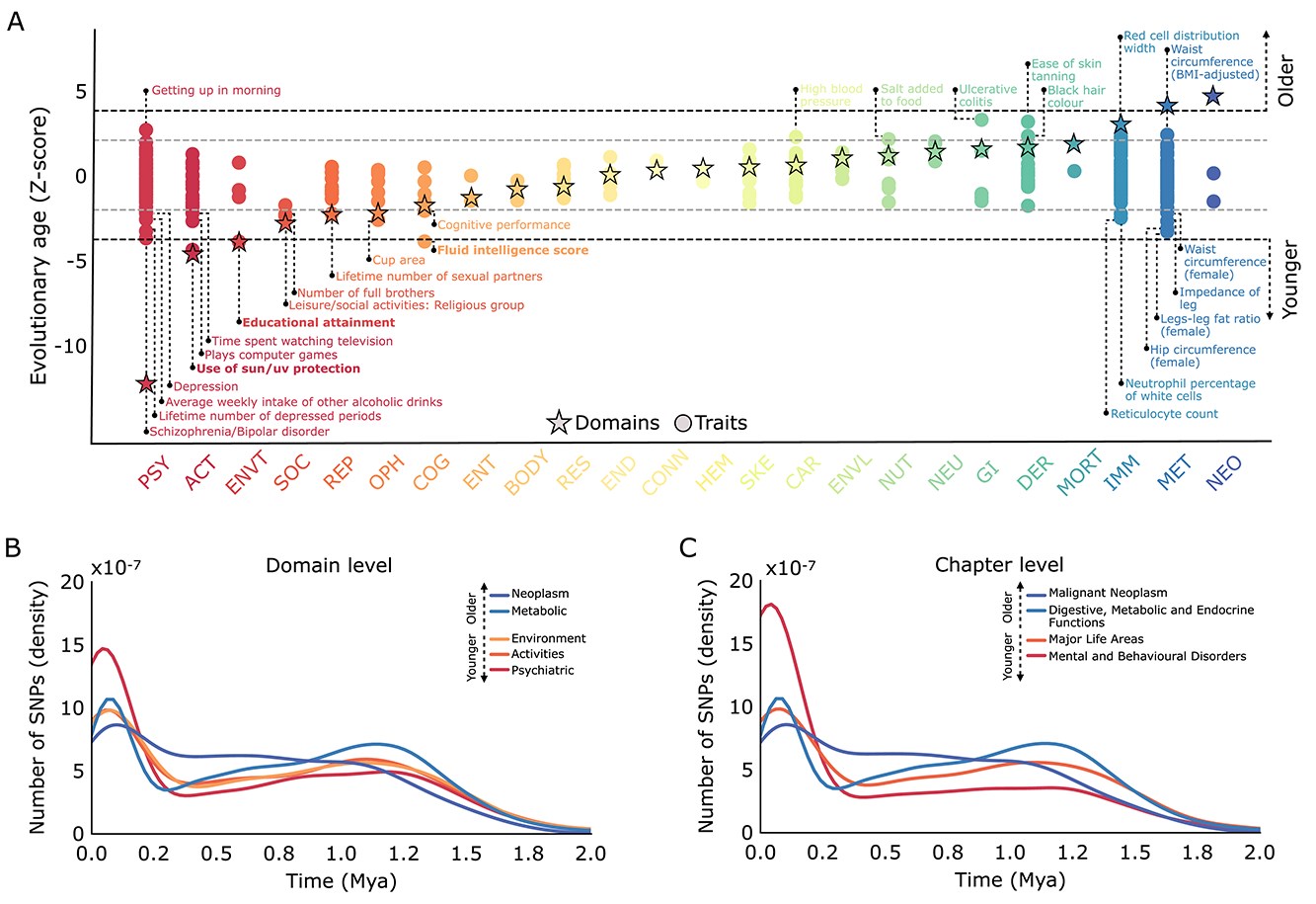 Хронология появления генов, связанных с человеческими признаками. A) На этом графике показано, насколько гены, отвечающие за разные признаки, являются эволюционно моложе (отрицательные значения, внизу) или старше (положительные значения, вверху), чем ожидалось случайно. Точки — это отдельные признаки, звезды — крупные категории признаков. Жирным шрифтом выделены признаки, чей возраст генов является наиболее статистически значимым. Цвета обозначают разные категории. B) Хронология появления генов для крупных категорий признаков. Категории, гены которых в среднем значительно моложе, включают «психиатрические», «активность» и «среда». В то же время гены, связанные с «метаболизмом» и «новообразованиями» (рак), оказались значительно старше. C) Хронология для более узких категорий. Категории с самыми молодыми генами — это «психические и поведенческие расстройства» и «основные сферы жизни». А категории, связанные с «пищеварением, метаболизмом и эндокринной системой», а также со «злокачественными новообразованиями», — самые старые. ACT: активность BMI: индекс массы тела BODY: строение тела CAR: сердечно-сосудистые CONN: соединительная ткань DER: дерматологические END: эндокринные ENVT: среда ENVL: относящиеся к окружающей среде GI: желудочно-кишечные HEM: гематологические IMM: иммунологические MET: метаболические MORT: смертность NEO: новообразования NEU: неврологические NUT: пищевые OPH: офтальмологические PSY: психиатрические REP: репродуктивные RES: респираторные SKE: скелетные SOC: социальные взаимодействия
