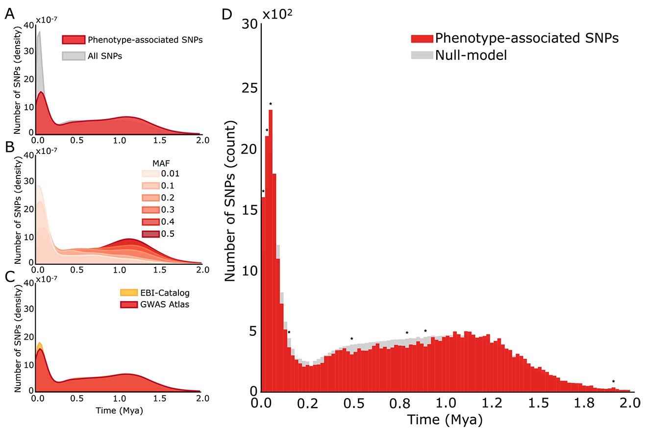 Хронология появления генетических вариантов (SNP), связанных с признаками человека. A) График показывает, как часто за последние 2 миллиона лет появлялись генетические варианты, связанные с признаками человека (данные GWAS), по сравнению со всеми известными генетическими вариантами (данные HGD). B) Тот же график, но варианты, связанные с признаками, разделены на группы по их частоте встречаемости в популяции (MAF) — от самых редких до самых частых. C) Проверка точности: сравнение результатов с другим независимым набором данных (EBI Catalog) показало почти полное совпадение. D) Реальное количество вариантов, связанных с признаками, которые появлялись в каждый 20-тысячелетний период. Звездочками (*) отмечены временные отрезки, когда их число было значительно выше, чем ожидалось случайно. MAF — частота встречаемости редкого варианта гена. Цитирование: Ilan Libedinsky, Yongbin Wei, Christiaan de Leeuw, James K Rilling, Danielle Posthuma, Martijn P van den Heuvel, The emergence of genetic variants linked to brain and cognitive traits in human evolution, Cerebral Cortex, Volume 35, Issue 8, August 2025, bhaf127, https://doi.org/10.1093/cercor/bhaf127