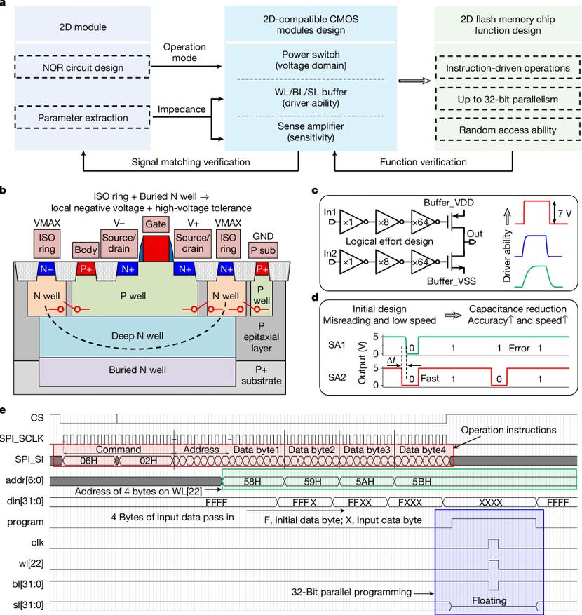 Архитектура чипа реализует прямое соединение двумерного массива памяти с логическими блоками КМОП, обеспечивая произвольный доступ и 32-битное параллельное управление. Ранее группа Лю продемонстрировала прототип с рекордной скоростью записи 400 пикосекунд. Текущая версия адаптирует эту технологию для серийного производства.