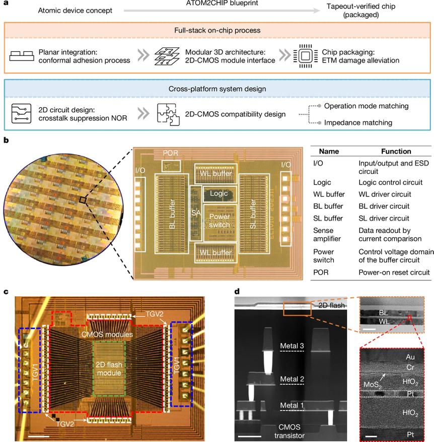 Команда Фуданьского университета под руководством Чунсена Лю создала первый промышленно совместимый чип памяти на основе двумерных материалов. Разработка описана в журнале Nature и представляет собой гибридное устройство, где флэш-память из дисульфида молибдена работает совместно с традиционным кремниевым контроллером.