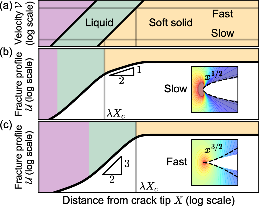 Когда скорость трещины увеличивается, средняя, «острая» зона с показателем 3/2, становится больше. Если трещина движется медленно, ее форма близка к параболе. Если трещина движется быстро, в ее форме преобладает острый конец.