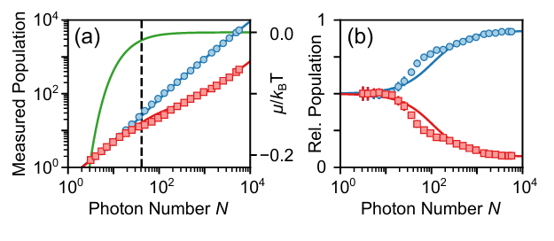 При увеличении числа фотонов в резонаторе нижний энергетический уровень начинает заполняться непропорционально быстро. В какой-то момент населенность верхнего уровня просто насыщается — перестает расти — и все новые фотоны устремляются в основное состояние. В итоге, при высокой плотности фотонов более 90% из них оказываются на самом нижнем энергетическом уровне.