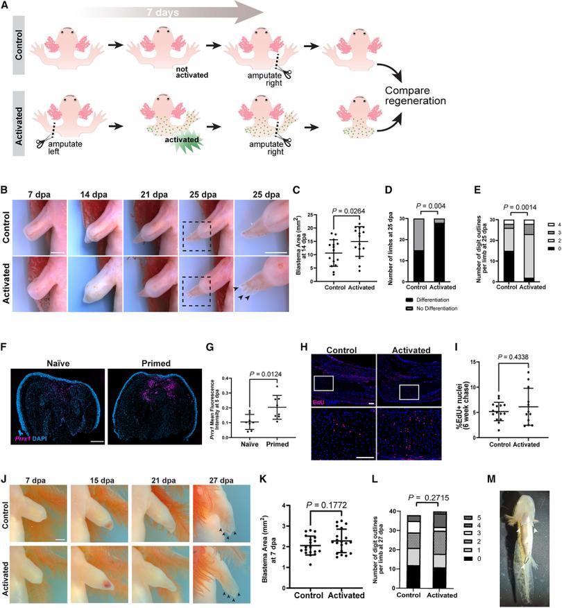 Исследователи провели простой эксперимент. Они разделили аксолотлей на две группы. У «наивных» животных ампутировали одну конечность и следили за ее восстановлением. У второй, «подготовленной» группы, сначала ампутировали одну лапу, а через некоторое время — другую, на противоположной стороне тела.