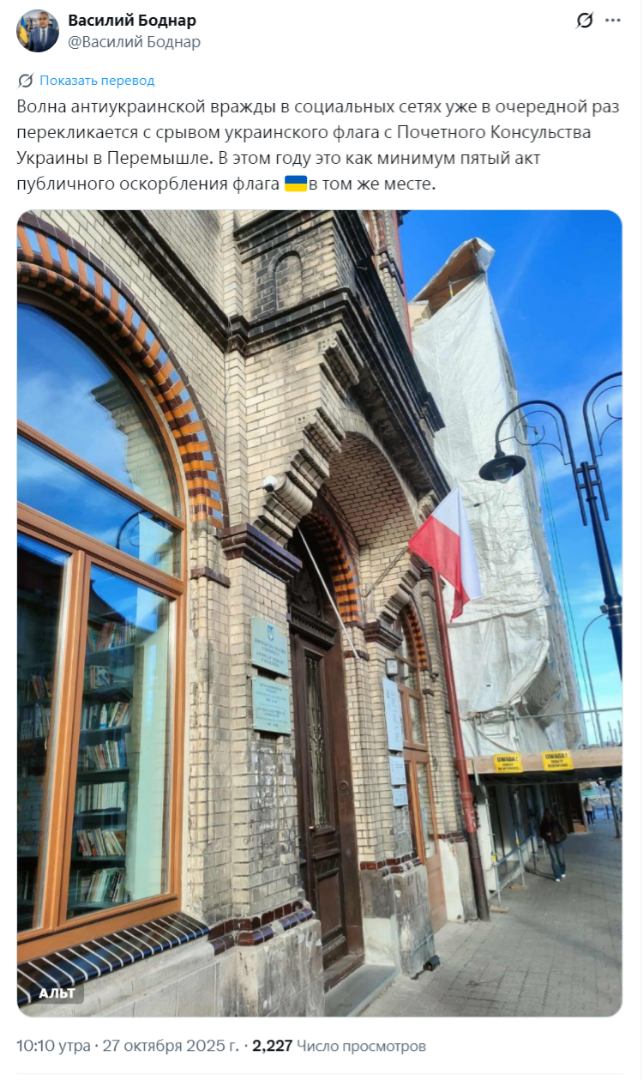 «Волна антиукраинского хейта в соцсетях снова привела к тому, что с почетного консульства Украины в Перемышле сорвали украинский флаг. За этот год — это как минимум пятый акт надругательства над флагом в том же месте», – заявил Боднар.