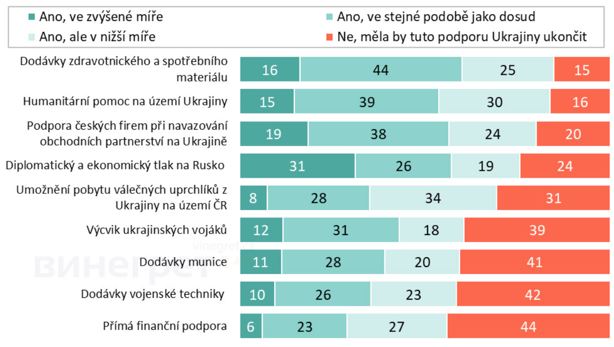 Из разделения по политическим предпочтениям респондентов следует, что избиратели движения ANO и партии Motoristé дальше поддерживали бы Украину поставками медицинских материалов и гуманитарной помощи, а также дипломатически и экономически ограничивали бы Россию. С другой стороны, подавляющее большинство прекратило бы прямую финансовую поддержку Украины. Избиратели ANO также отвергают поставки боеприпасов, военной техники и обучение украинских солдат.