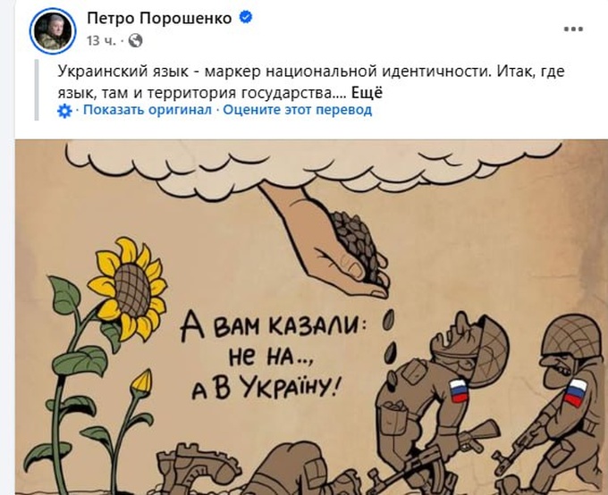 «Украинский язык – маркер национальной идентичности. Итак, где язык, там и территория государства. Это слова моего друга, борца за украинскую мову, Героя Украины Андрия Парубия. Они лучший навигатор в нашей борьбе. Потому что украинский язык – это наши корни, которыми мы вгрызаемся в нашу землю. И мы ее никому не отдадим», – пафосно заявил Порошенко.