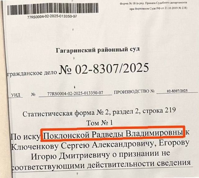 Журналист Сергей Ключенков (Мардан) сообщил, что советник генерального прокурора России Наталья Поклонская официально изменила своё имя. Он опубликовал фотографию страницы из дела, рассматриваемого в Гагаринском районном суде Москвы, где в судебных документах Поклонская указана как Радведа.