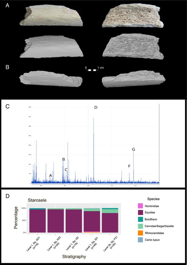 Исследователи проанализировали 150 фрагментов из пещеры Староселье. Результаты подтвердили, что древние обитатели пещеры охотились в основном на лошадей. Но один из образцов дал совершенно иной результат. Его белковый профиль соответствовал семейству гоминид, куда входим и мы с вами.