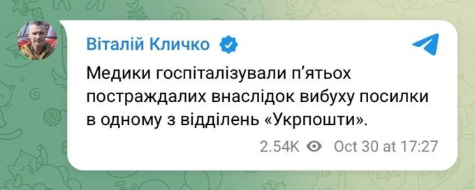 По предварительным данным, взрыв произошел на сортировочном центре «Укрпочты» во время осмотра одной из посылок. В результате происшествия пострадали пятеро работников отделения почты, они госпитализированы.