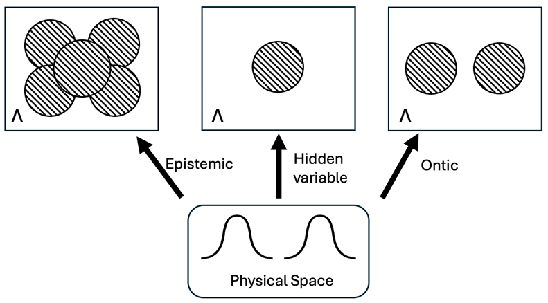 - Сделаем допущение. Представим на минуту, что эпистемическая картина верна. Это означает, что области описания разных квантовых состояний могут перекрываться. То есть, одно и то же базовое состояние со скрытыми переменными может при подготовке эксперимента проявиться как одно из нескольких различных квантовых состояний.