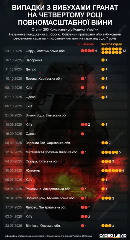 Полномасштабные боевые действия добавили в повседневную жизнь украинцев еще одну опасность — неконтролируемое распространение взрывоопасных веществ, в частности, боевых гранат. Только за неполный 2025 год, по официальным данным, граната более 20 раз выступала «аргументом» в разрешении бытовых споров, хвастовство ими приводило к детонации боеприпасов в квартирах.