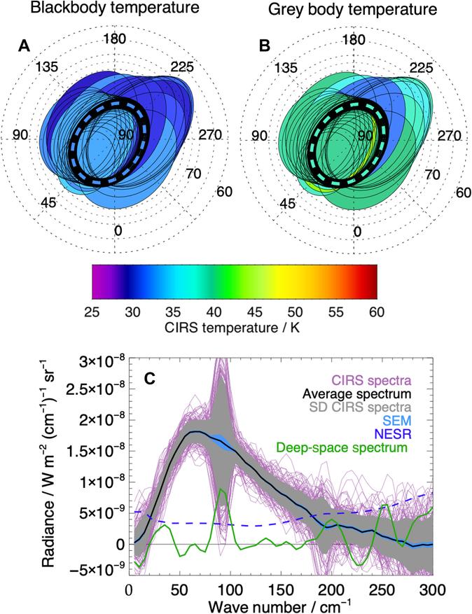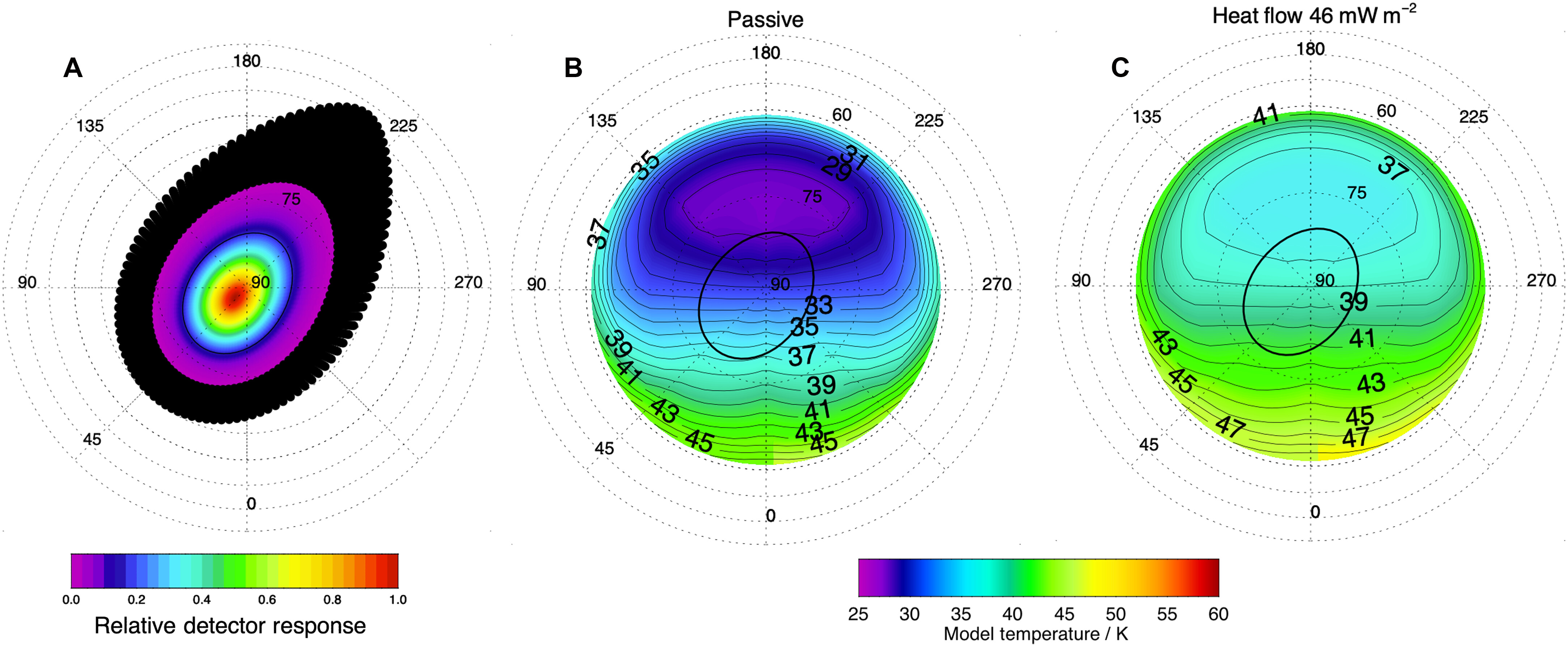 Ученые создали модель, чтобы рассчитать, какой должна быть температура поверхности в таких условиях. Пассивная модель — это, по сути, расчет, который учитывает только внешние источники тепла: тусклый солнечный свет на орбите Сатурна и тепловое излучение, отраженное от самого газового гиганта. Модель предсказала температуру около 31 кельвина (−242 °C).