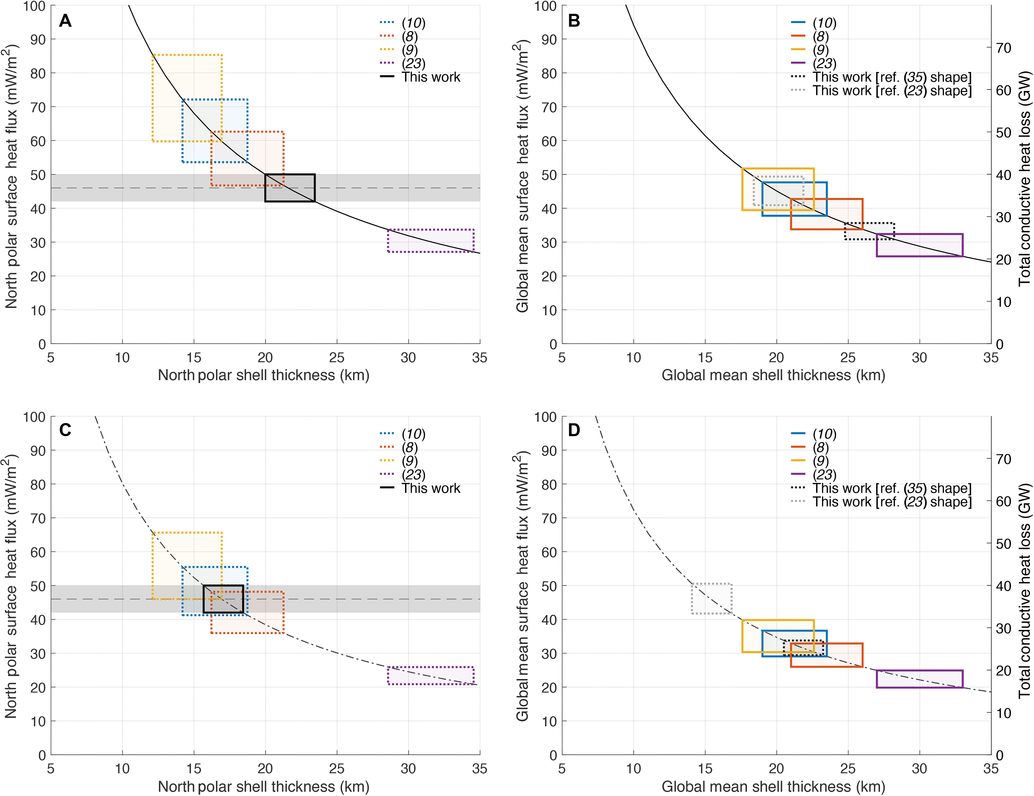 Расчеты, основанные на потоке в 46 мВт/м², показали: толщина ледяной оболочки на северном полюсе Энцелада составляет от 20 до 23 километров. Эта цифра почти идеально совпадает с оценками, полученными другими методами — на основе анализа гравитационного поля луны и ее легкого покачивания (либрации) при вращении вокруг Сатурна.