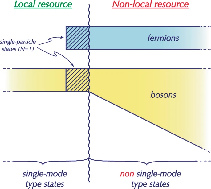 Фермионы (электроны, протоны, нейтроны) подчиняются принципу запрета Паули. Этот принцип гласит, что два одинаковых фермиона не могут находиться в одном и том же квантовом состоянии. Они — абсолютные индивидуалисты. Из этого следует прямой вывод: любое состояние, состоящее из двух или более фермионов, никогда не может быть одномодовым. Они просто физически не могут стартовать из одной моды. Следовательно, любое состояние из двух и более фермионов всегда является подлинным нелокальным ресурсом.