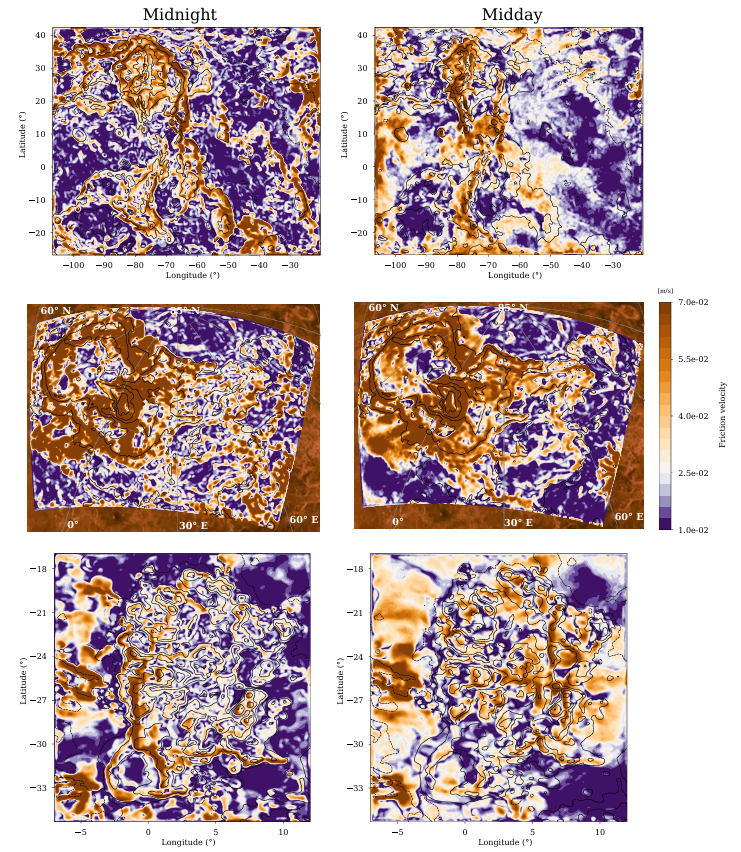 Результаты показали, что на значительных территориях — особенно ночью и на западных склонах гор — ветер достаточно силен, чтобы запустить процесс сальтации. Это явление, при котором частицы (модель рассматривала пылинки размером 75 микрометров) отрываются от поверхности и совершают серию коротких скачков.