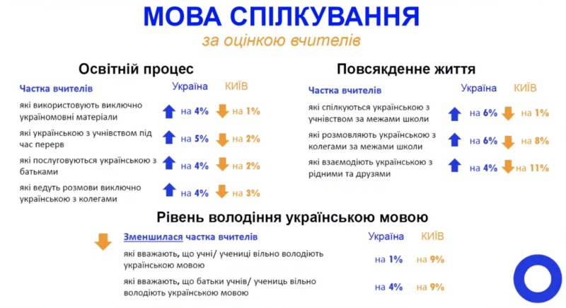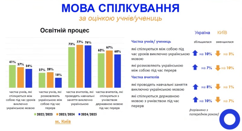 В 2025 году украинский родным считают лишь 32% учеников Киева. Русский или оба языка называют родными 28% родителей и 15% учителей.