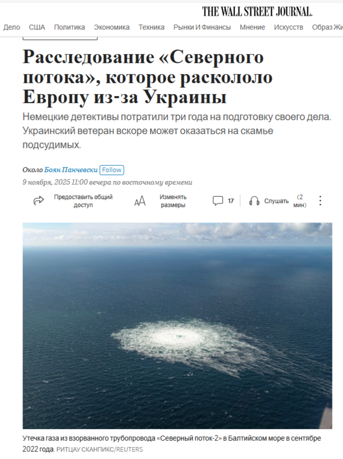 Именно поэтому The Wall Street Journal так озабочена тем, что «результаты трехлетнего расследования диверсий на газопроводах "Северный поток" и "Северный поток – 2", раскалывают Европу, грозя подрывом поддержки Украины», на которую немецкие детективы возлагают ответственность за произошедшее. Любое судебное слушание «ещё больше обострит отношения между Украиной и Германией, крупнейшим финансовым спонсором Киева и поставщиком некоторых из самых востребованных военных систем, особенно ПВО».