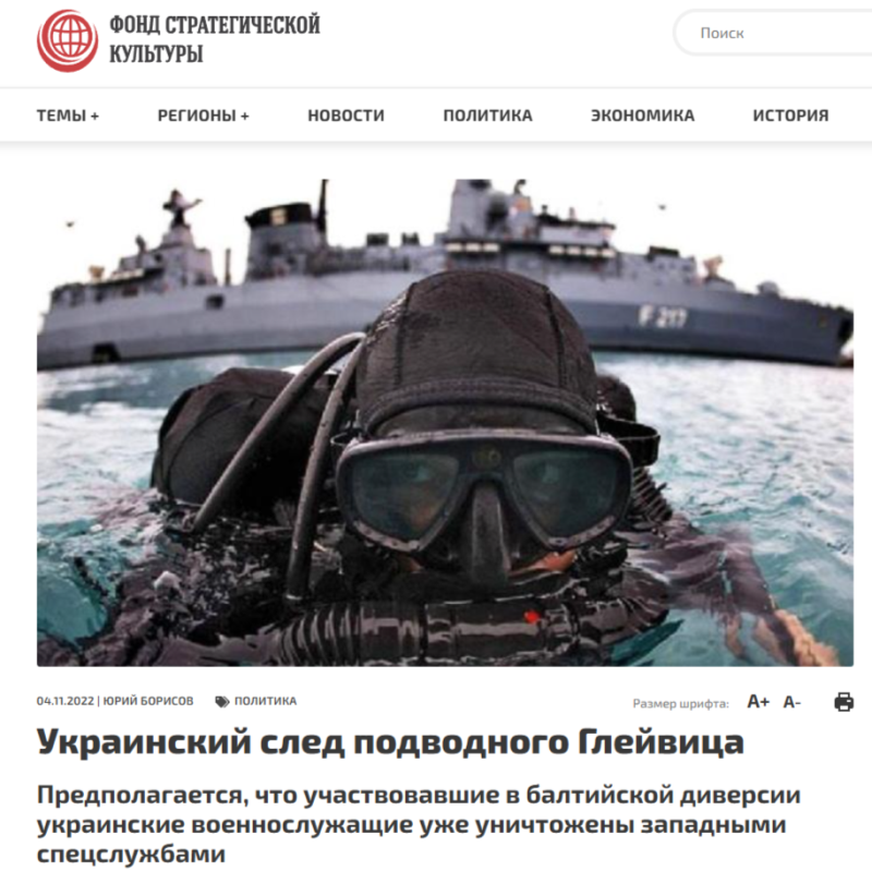 Что касается «украинского следа» этой диверсии, то так вышло, что автор этих строк, намного раньше The Wall Street Journal и тому прочих, не сомневался в том, что именно так и было. В статье «Украинский след подводного Гляйвица» приводилось немало аргументов в пользу этой тогда ещё чисто умозрительной версии, которые, впрочем, до сих пор никем не опровергнуты.