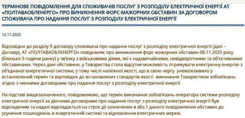 «Компания утратила возможность получать электроэнергию из объединённой сети. Это привело к невозможности выполнять обязательства перед потребителями в установленные сроки и с требуемым качеством», — официально заявили о наступлении форс-мажорных обстоятельств в «Полтаваоблэнерго».