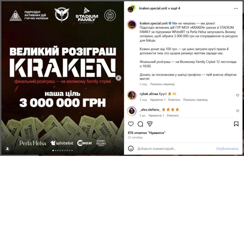 Согласно официальной странице в Facebook*** дочки «95 Квартала», которой владеет Миндич — «Стадиум Фэмили» совместно с еще одним медийным подразделением ГУР МОУ «Кракен» проводила сборы с населения на нужды ВСУ.